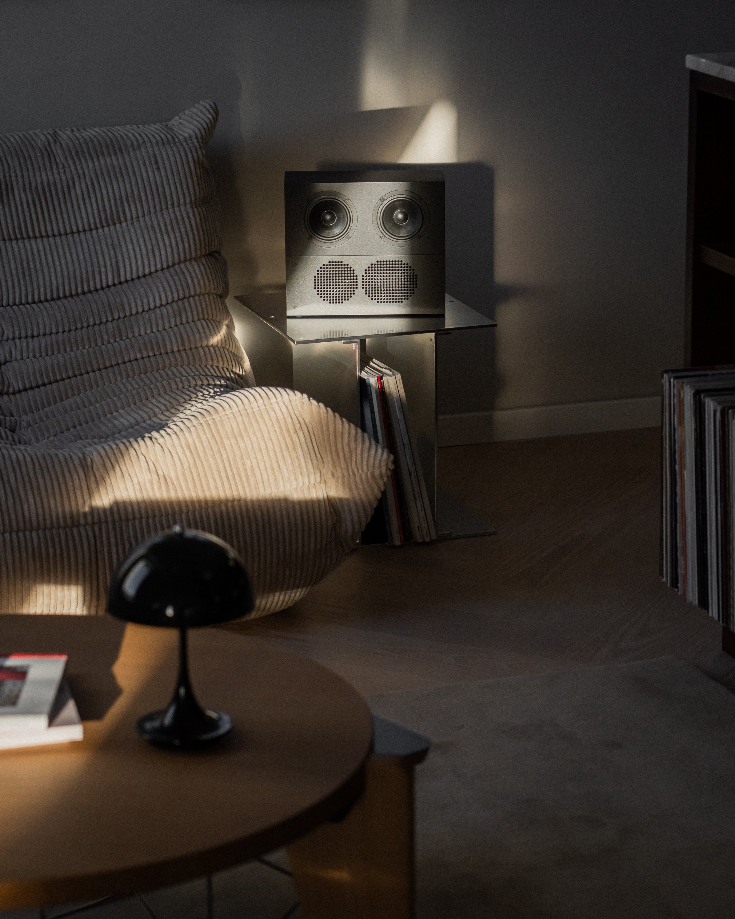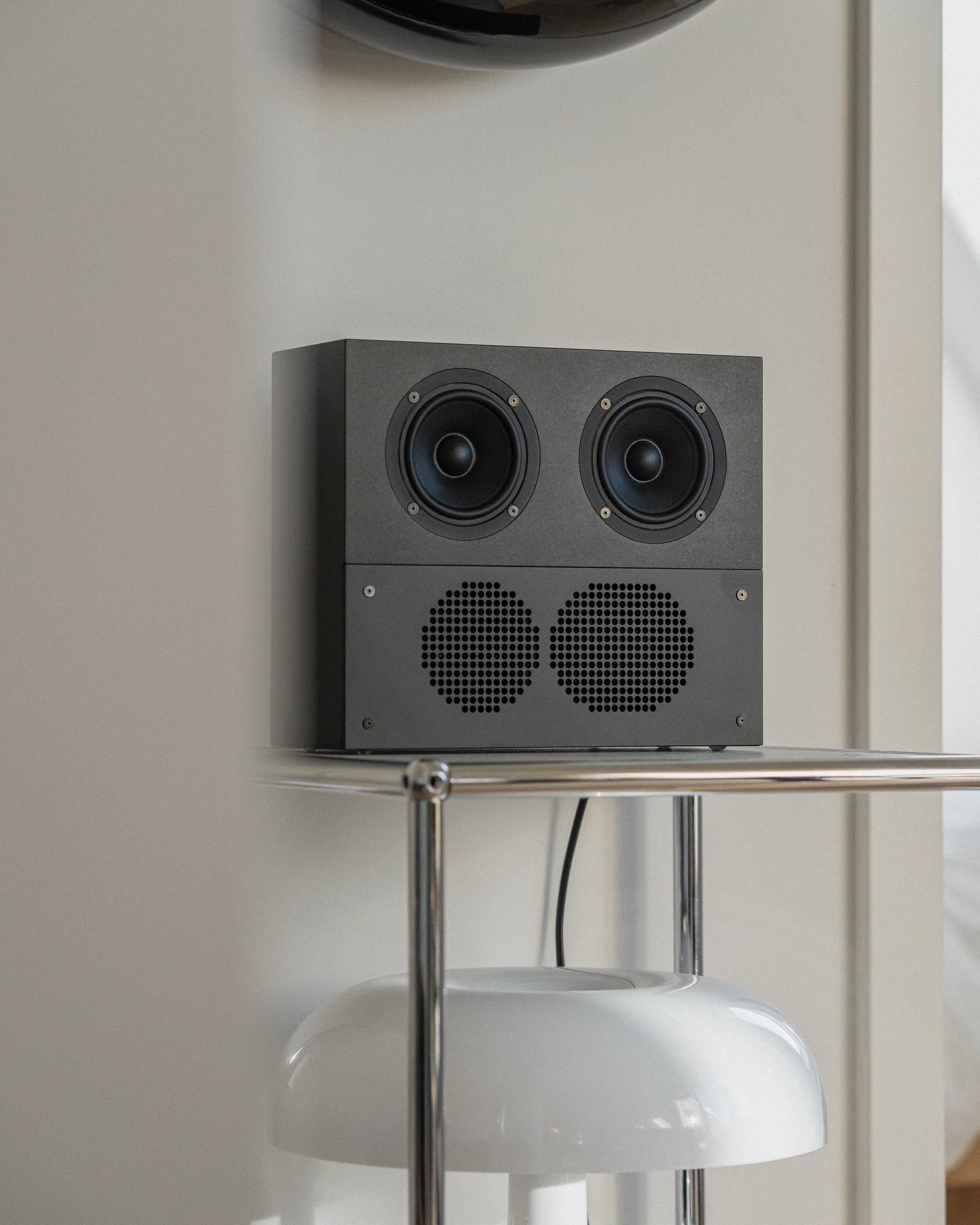 パッシブラジエーターを覆う陽極酸化アルミニウムプレートには、細心の注意を払って穴が開けられたピクセルパターンが施されており、Mini にスタイルと機能を融合させた時代を超越した外観を与えています。